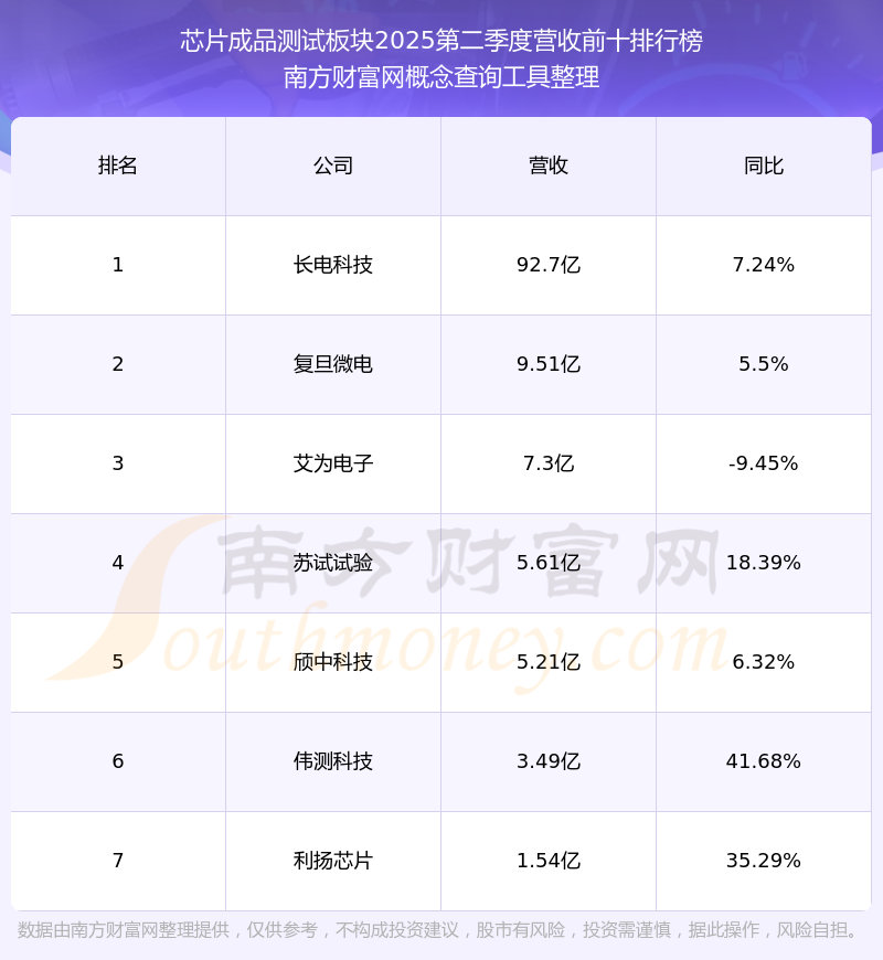 按照南方財(cái)富網(wǎng)概念查詢工具統(tǒng)計(jì),該股所屬板塊為芯片成品測試板塊,該板塊共有7只股票,偉測科技2025第二季度營收在該板塊中排名為第6名,該板塊2025第二季度營收排名前十的股票如下表: