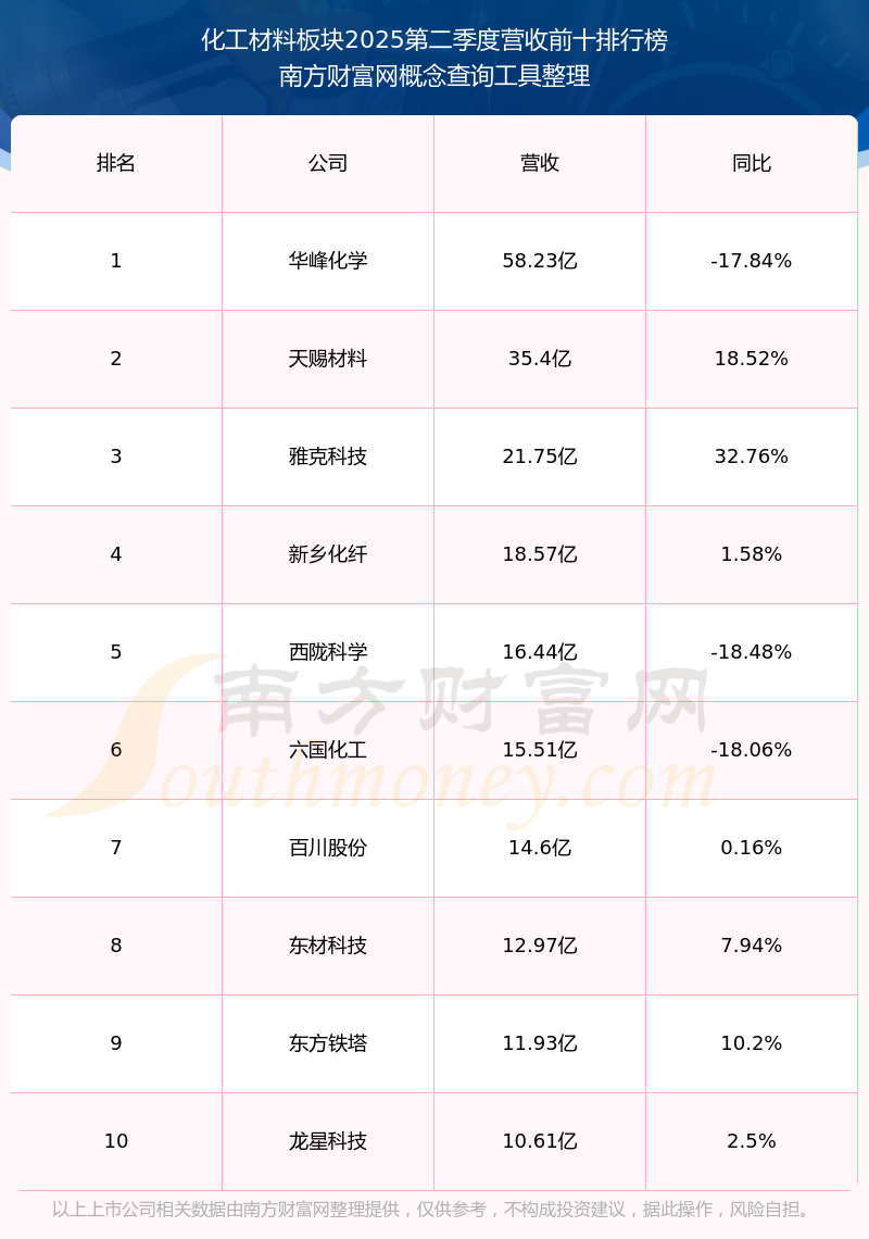 按照南方財富網概念查詢工具統(tǒng)計,該股所屬板塊為化工材料板塊,該板塊共有23只股票,大位科技2025第二季度營收在該板塊中排名為第23名,該板塊2025第二季度營收排名前十的股票如下表: