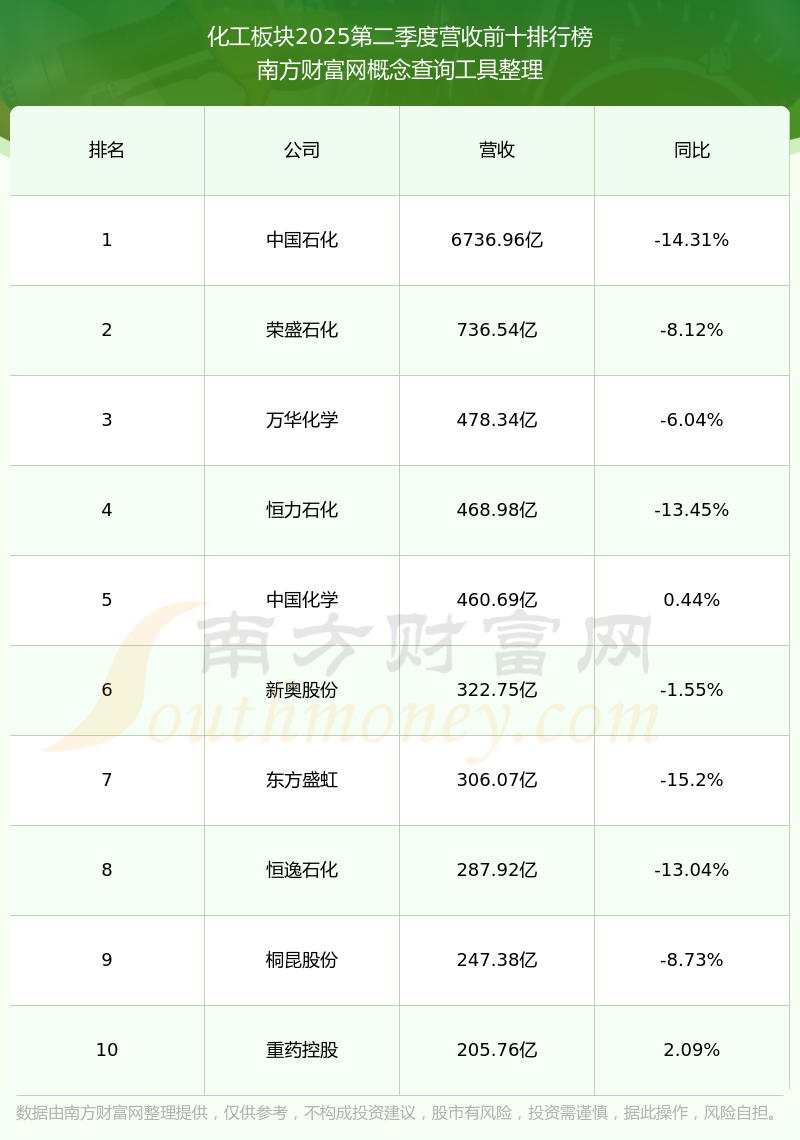 按照南方財富網(wǎng)概念查詢工具統(tǒng)計,該股所屬板塊為化工板塊,該板塊共有569只股票,江山股份2025第二季度營收在該板塊中排名為第142名,該板塊2025第二季度營收排名前十的股票如下表: