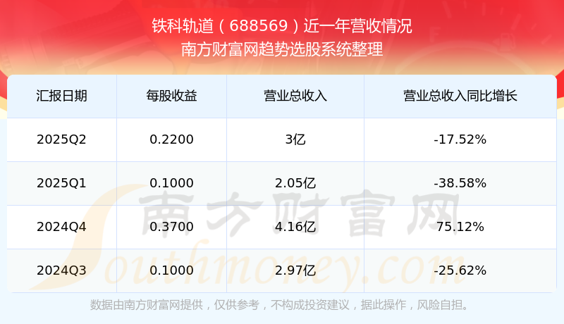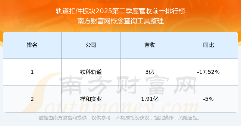 按照南方財(cái)富網(wǎng)概念查詢工具統(tǒng)計(jì),該股所屬板塊為軌道扣件板塊,該板塊共有2只股票,鐵科軌道2025第二季度營收在該板塊中排名為第1名,該板塊2025第二季度營收排名前十的股票如下表: