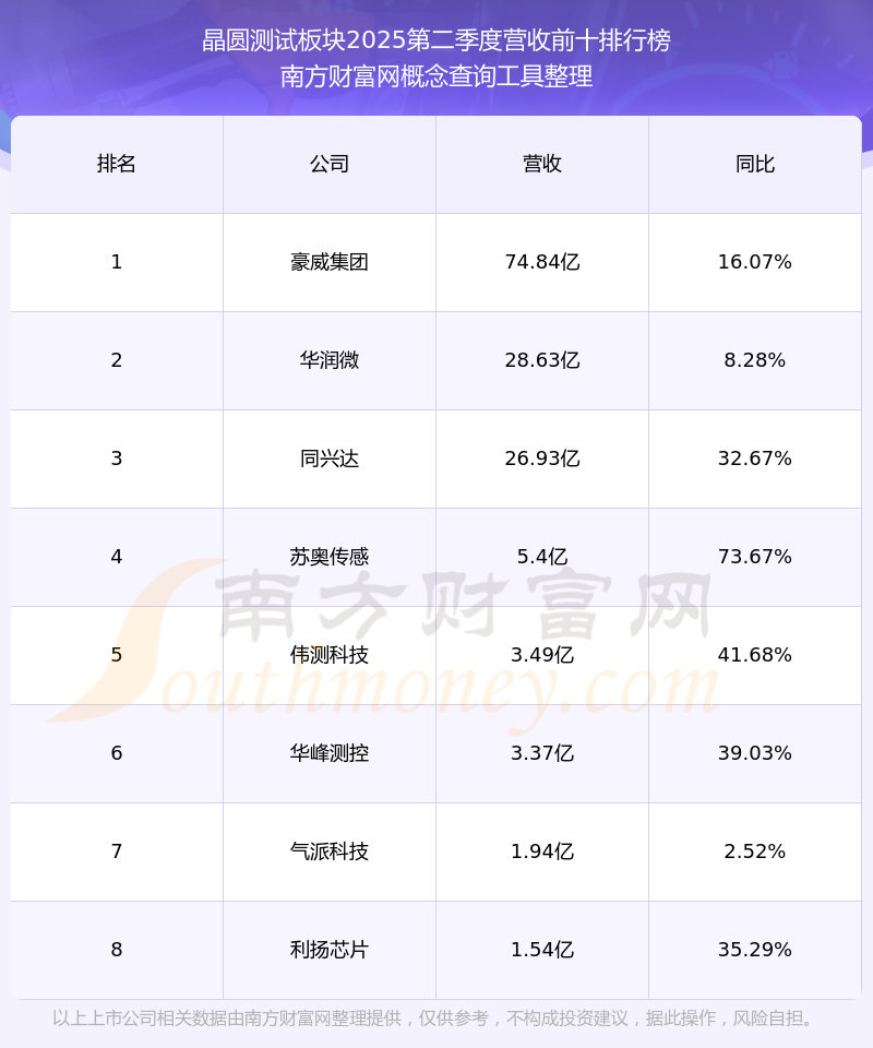 按照南方財(cái)富網(wǎng)概念查詢工具統(tǒng)計(jì),該股所屬板塊為晶圓測試板塊,該板塊共有8只股票,利揚(yáng)芯片2025第二季度營收在該板塊中排名為第8名,該板塊2025第二季度營收排名前十的股票如下表:
