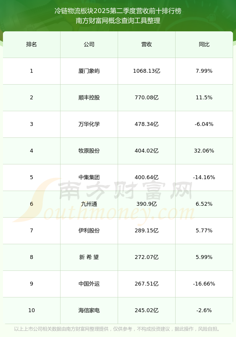 按照南方財(cái)富網(wǎng)概念查詢工具統(tǒng)計(jì),該股所屬板塊為冷鏈物流板塊,該板塊共有145只股票,福成股份2025第二季度營(yíng)收在該板塊中排名為第126名,該板塊2025第二季度營(yíng)收排名前十的股票如下表: