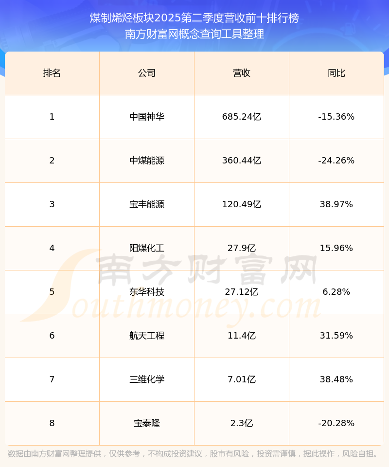 按照南方財富網(wǎng)概念查詢工具統(tǒng)計,該股所屬板塊為煤制烯烴板塊,該板塊共有8只股票,寶豐能源2025第二季度營收在該板塊中排名為第3名,該板塊2025第二季度營收排名前十的股票如下表: