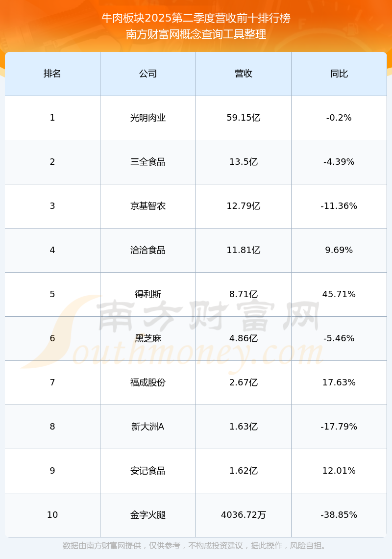按照南方財富網(wǎng)概念查詢工具統(tǒng)計,該股所屬板塊為牛肉板塊,該板塊共有11只股票,味知香2025第二季度營收在該板塊中排名為第11名,該板塊2025第二季度營收排名前十的股票如下表: