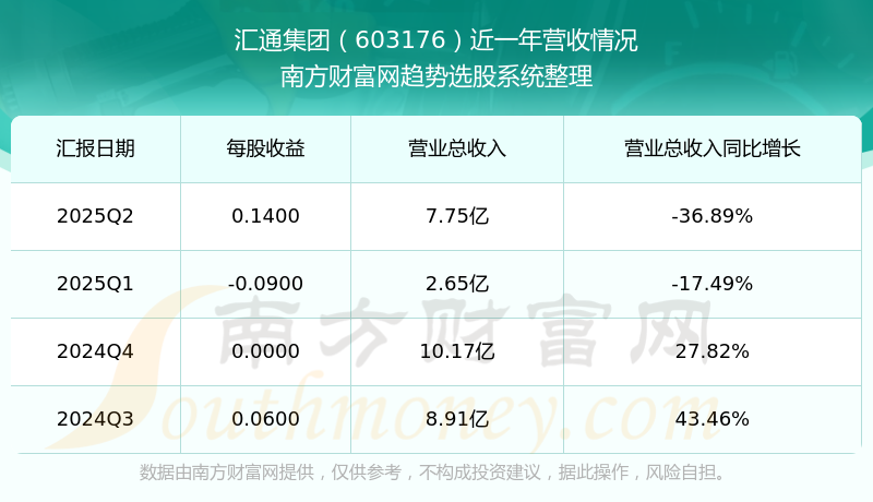 匯通集團(tuán)(603176)披露2025年第二季度報告,報告期實現(xiàn)營收7.75億元,同比-36.89%;歸母凈利潤6650.72萬元,同比-15.19%;扣非凈利潤6571.86萬元,同比-12.9%;基本每股收益0.14元。