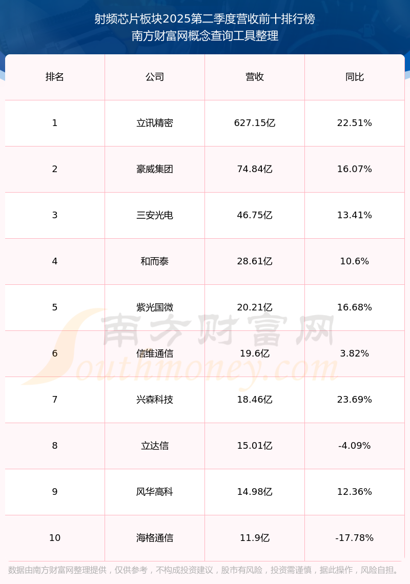 按照南方財富網(wǎng)概念查詢工具統(tǒng)計,該股所屬板塊為射頻芯片板塊,該板塊共有57只股票,國博電子2025第二季度營收在該板塊中排名為第24名,該板塊2025第二季度營收排名前十的股票如下表: