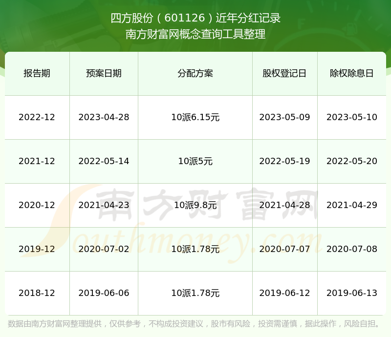 四方股份最新一次公布的分紅方案為10派6.15元。本次權(quán)益分派股權(quán)登記日為2023年5月9日,除權(quán)除息日為2023年5月10日,派息日為2023年5月10日。