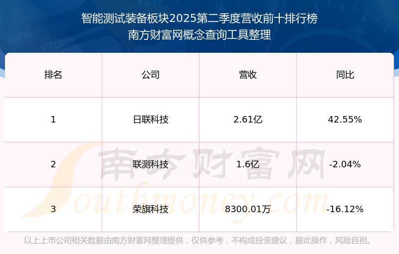 按照南方財富網(wǎng)概念查詢工具統(tǒng)計,該股所屬板塊為智能測試裝備板塊,該板塊共有3只股票,聯(lián)測科技2025第二季度營收在該板塊中排名為第2名,該板塊2025第二季度營收排名前十的股票如下表: