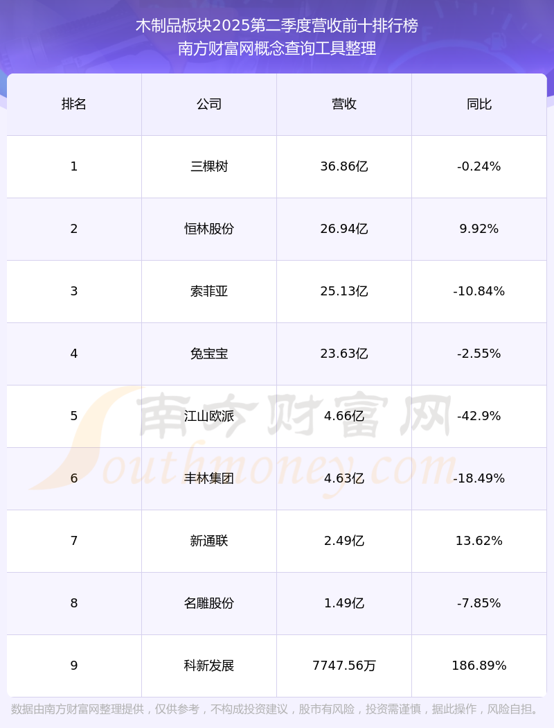按照南方財富網(wǎng)概念查詢工具統(tǒng)計,該股所屬板塊為木制品板塊,該板塊共有9只股票,江蘇舜天2025第二季度營收在該板塊中排名為第9名,該板塊2025第二季度營收排名前十的股票如下表: