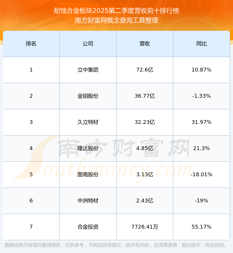 按照南方財(cái)富網(wǎng)概念查詢工具統(tǒng)計(jì),該股所屬板塊為耐蝕合金板塊,該板塊共有7只股票,隆達(dá)股份2025第二季度營(yíng)收在該板塊中排名為第4名,該板塊2025第二季度營(yíng)收排名前十的股票如下表: