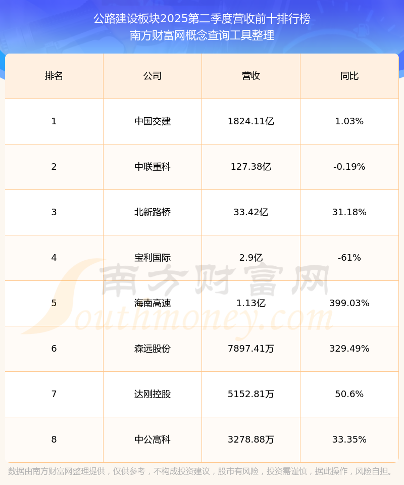 按照南方財(cái)富網(wǎng)概念查詢工具統(tǒng)計(jì),該股所屬板塊為公路建設(shè)板塊,該板塊共有8只股票,交建股份2025第二季度營(yíng)收在該板塊中排名為第8名,該板塊2025第二季度營(yíng)收排名前十的股票如下表: