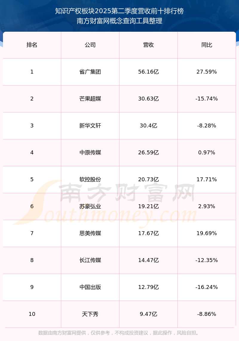 按照南方財(cái)富網(wǎng)概念查詢工具統(tǒng)計(jì),該股所屬板塊為知識(shí)產(chǎn)權(quán)板塊,該板塊共有52只股票,京華激光2025第二季度營(yíng)收在該板塊中排名為第34名,該板塊2025第二季度營(yíng)收排名前十的股票如下表: