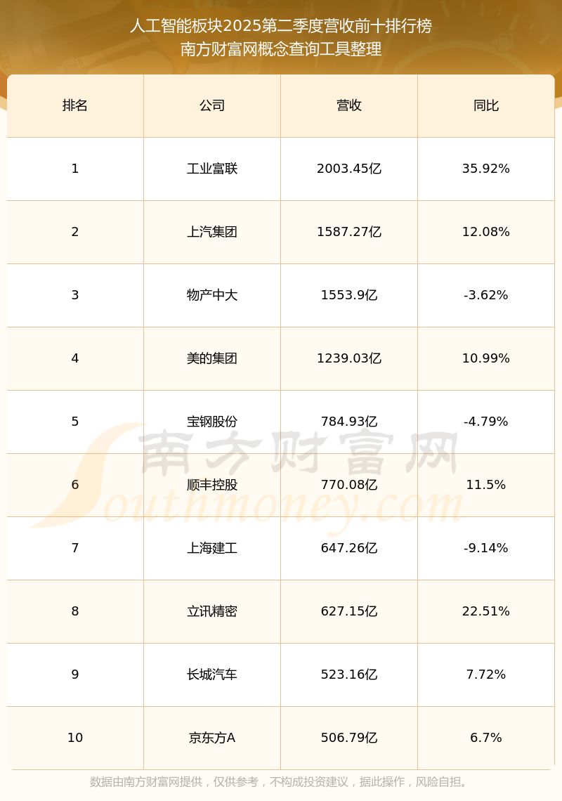 按照南方財(cái)富網(wǎng)概念查詢工具統(tǒng)計(jì),該股所屬板塊為人工智能板塊,該板塊共有966只股票,蘇州科達(dá)2025第二季度營收在該板塊中排名為第687名,該板塊2025第二季度營收排名前十的股票如下表: