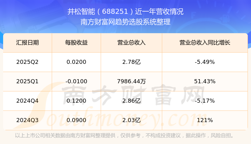 在2025年第二季度,井松智能的業(yè)績表現(xiàn),主營業(yè)務收入達到2.78億元,實現(xiàn)了-5.49%的同比增長率。同時,公司歸母凈利潤錄得121.67萬元,同比增長-96.6%。