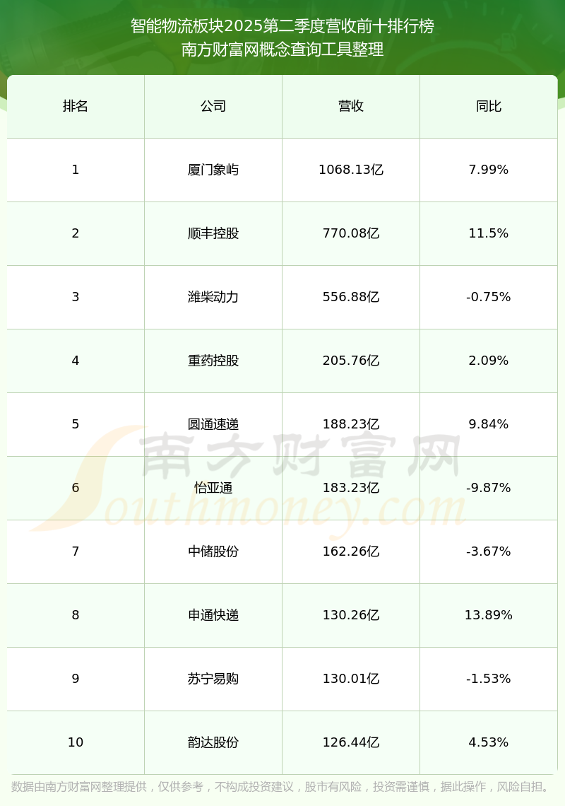 按照南方財富網(wǎng)概念查詢工具統(tǒng)計,該股所屬板塊為智能物流板塊,該板塊共有85只股票,井松智能2025第二季度營收在該板塊中排名為第61名,該板塊2025第二季度營收排名前十的股票如下表: