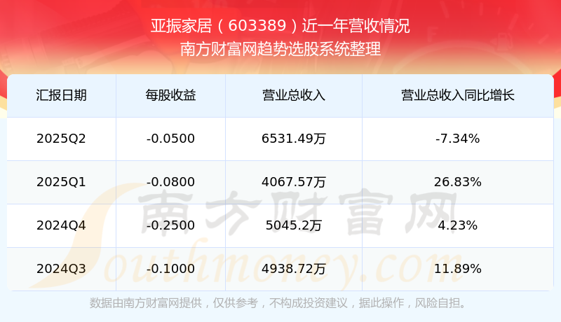 亞振家居2025年第二季度公司實(shí)現(xiàn)營(yíng)業(yè)收入6531.49萬(wàn)元,同比-7.34%;歸母凈利潤(rùn)-1178.01萬(wàn)元,同比-6735.66%。