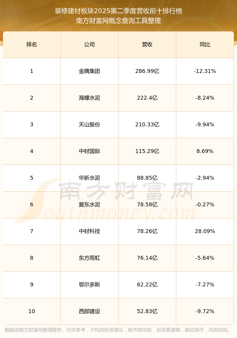 按照南方財(cái)富網(wǎng)概念查詢工具統(tǒng)計(jì),該股所屬板塊為裝修建材板塊,該板塊共有82只股票,亞振家居2025第二季度營(yíng)收在該板塊中排名為第82名,該板塊2025第二季度營(yíng)收排名前十的股票如下表: