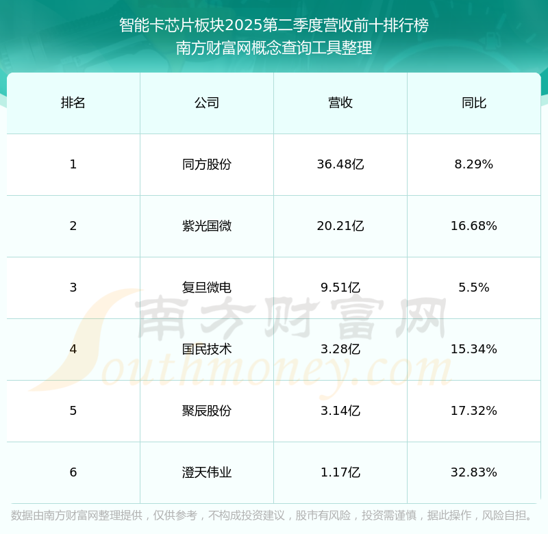 按照南方財(cái)富網(wǎng)概念查詢工具統(tǒng)計(jì),該股所屬板塊為智能卡芯片板塊,該板塊共有6只股票,聚辰股份2025第二季度營(yíng)收在該板塊中排名為第5名,該板塊2025第二季度營(yíng)收排名前十的股票如下表: