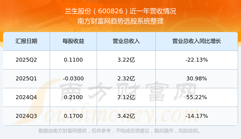 蘭生股份2025年第二季度顯示,公司主營收入3.22億元,同比-22.13%;歸母凈利潤8152.24萬元,同比-6.77%;扣非凈利潤6444.36萬元,同比-33.36%;
