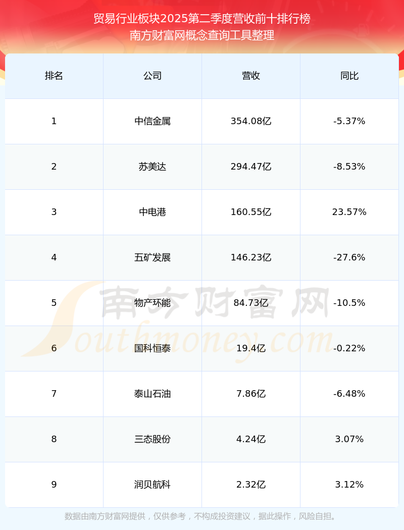 按照南方財富網(wǎng)概念查詢工具統(tǒng)計,該股所屬板塊為貿(mào)易行業(yè)板塊,該板塊共有9只股票,蘭生股份2025第二季度營收在該板塊中排名為第9名,該板塊2025第二季度營收排名前十的股票如下表:
