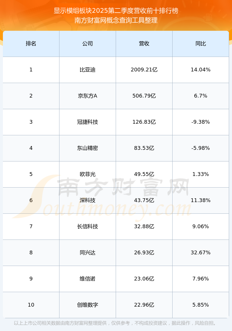 按照南方財(cái)富網(wǎng)概念查詢工具統(tǒng)計(jì),該股所屬板塊為顯示模組板塊,該板塊共有31只股票,凱盛科技2025第二季度營(yíng)收在該板塊中排名為第12名,該板塊2025第二季度營(yíng)收排名前十的股票如下表: