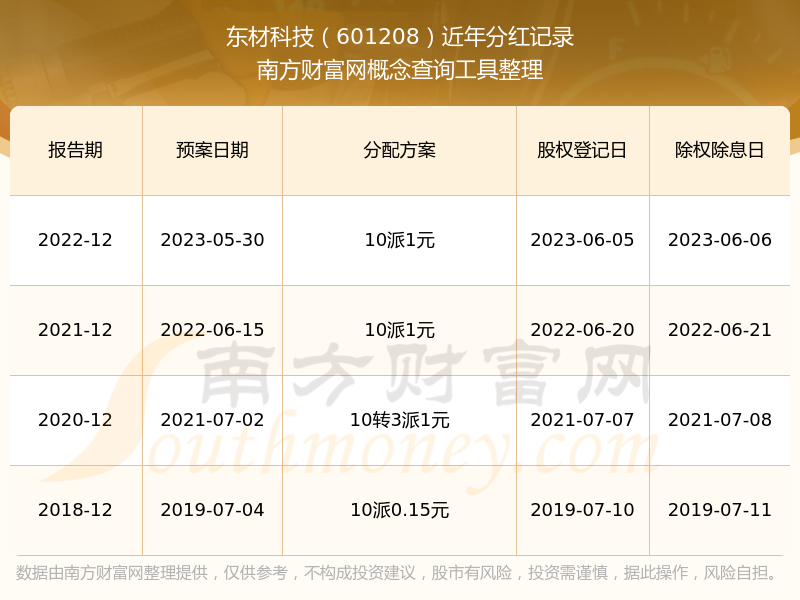 東材科技最新一次公布的分紅方案為10派1元。本次權益分派股權登記日為2023年6月5日,除權除息日為2023年6月6日,派息日為2023年6月6日。