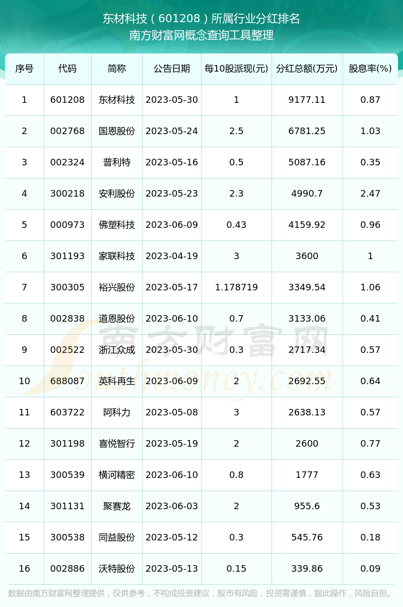 按照南方財富網(wǎng)趨勢選股系統(tǒng)統(tǒng)計,東材科技所屬行業(yè)為塑料制品行業(yè),塑料制品行業(yè)分紅排名情況如下表: