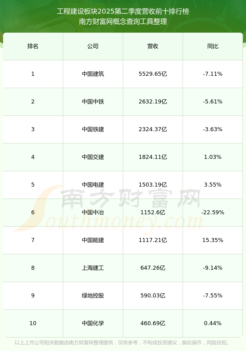 按照南方財(cái)富網(wǎng)概念查詢工具統(tǒng)計(jì),該股所屬板塊為工程建設(shè)板塊,該板塊共有140只股票,陜建股份2025第二季度營收在該板塊中排名為第11名,該板塊2025第二季度營收排名前十的股票如下表: