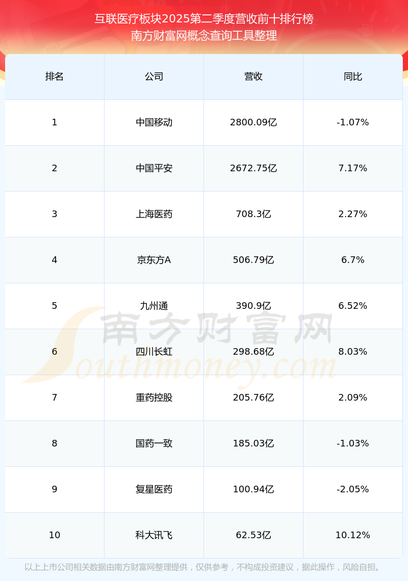 按照南方財富網(wǎng)概念查詢工具統(tǒng)計,該股所屬板塊為互聯(lián)醫(yī)療板塊,該板塊共有127只股票,九州通2025第二季度營收在該板塊中排名為第5名,該板塊2025第二季度營收排名前十的股票如下表: