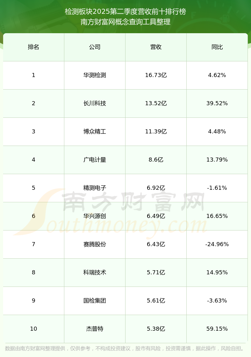 按照南方財(cái)富網(wǎng)概念查詢工具統(tǒng)計(jì),該股所屬板塊為檢測(cè)板塊,該板塊共有23只股票,思科瑞2025第二季度營(yíng)收在該板塊中排名為第23名,該板塊2025第二季度營(yíng)收排名前十的股票如下表:
