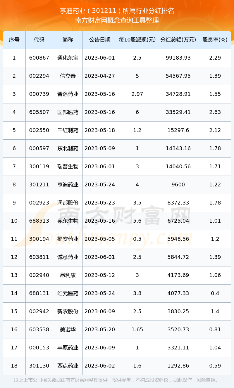 二、亨迪藥業(yè)301211行業(yè)分紅排名