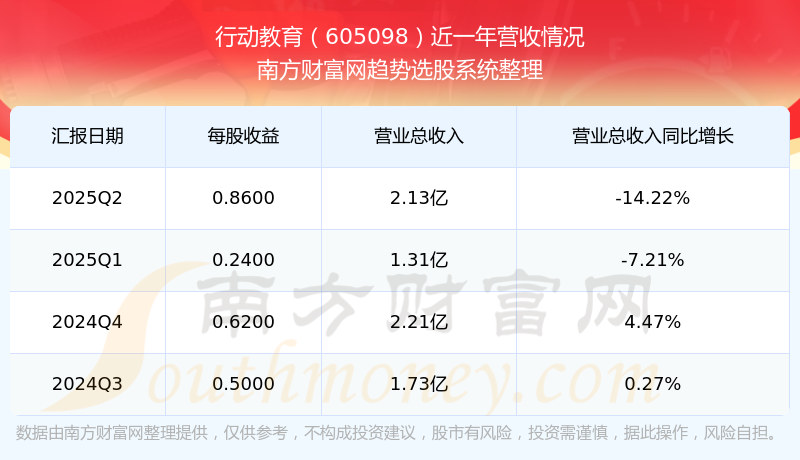 行動教育(605098)發(fā)布2025年第二季度財報。2025年第二季度行動教育實(shí)現(xiàn)營業(yè)收入2.13億元,同比增加-14.22元%,環(huán)比增加63.16%;凈利潤為1.03億元,同比增長-8.06%,環(huán)比增長265.04%。