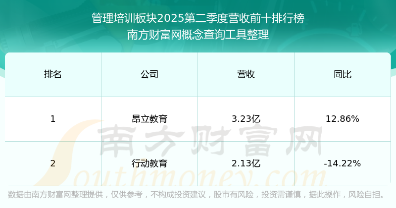 按照南方財富網(wǎng)概念查詢工具統(tǒng)計,該股所屬板塊為管理培訓(xùn)板塊,該板塊共有2只股票,行動教育2025第二季度營收在該板塊中排名為第2名,該板塊2025第二季度營收排名前十的股票如下表: