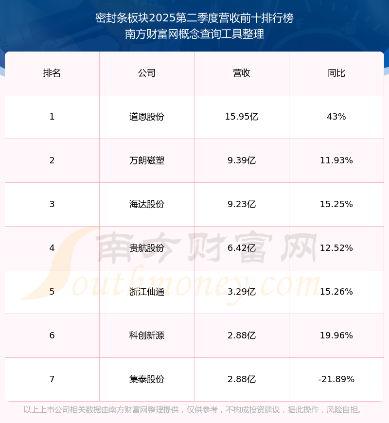 按照南方財富網(wǎng)概念查詢工具統(tǒng)計,該股所屬板塊為密封條板塊,該板塊共有7只股票,貴航股份2025第二季度營收在該板塊中排名為第4名,該板塊2025第二季度營收排名前十的股票如下表: