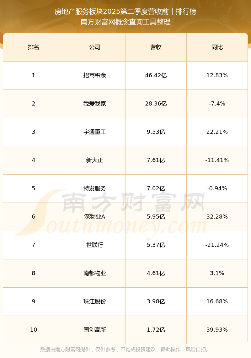 按照南方財(cái)富網(wǎng)概念查詢工具統(tǒng)計(jì),該股所屬板塊為房地產(chǎn)服務(wù)板塊,該板塊共有11只股票,北辰實(shí)業(yè)2025第二季度營收在該板塊中排名為第11名,該板塊2025第二季度營收排名前十的股票如下表: