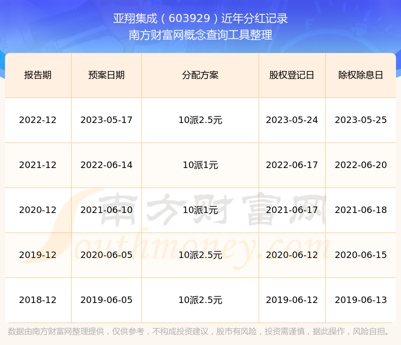 亞翔集成最新一次公布的分紅方案為10派2.5元。本次權(quán)益分派股權(quán)登記日為2023年5月24日,除權(quán)除息日為2023年5月25日,派息日為2023年5月25日。