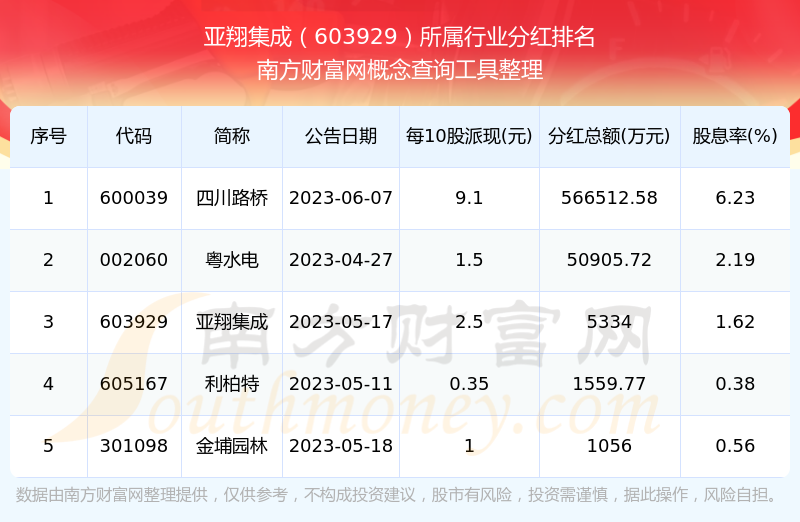 按照南方財富網(wǎng)趨勢選股系統(tǒng)統(tǒng)計,亞翔集成所屬行業(yè)為工程施工行業(yè),工程施工行業(yè)分紅排名情況如下表: