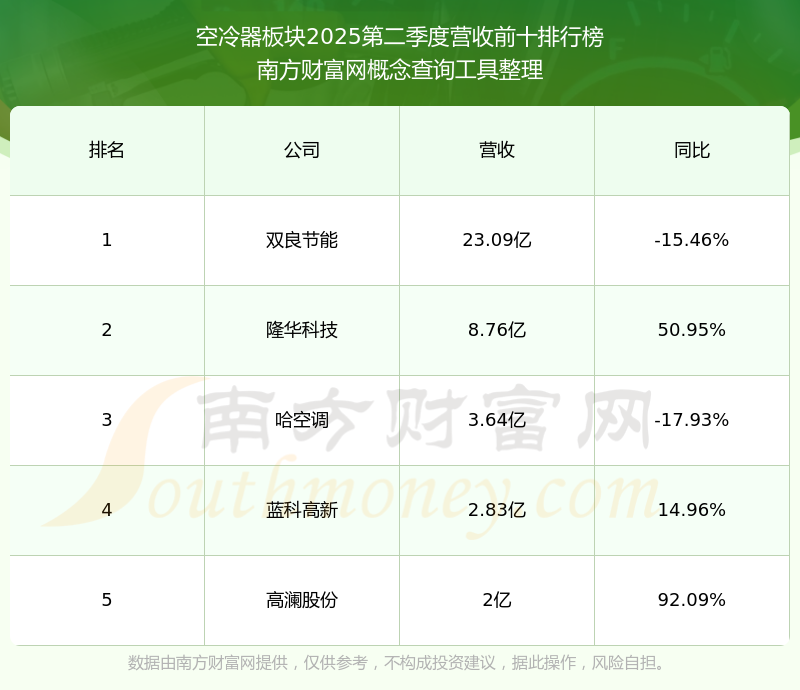 按照南方財富網(wǎng)概念查詢工具統(tǒng)計,該股所屬板塊為空冷器板塊,該板塊共有5只股票,哈空調2025第二季度營收在該板塊中排名為第3名,該板塊2025第二季度營收排名前十的股票如下表: