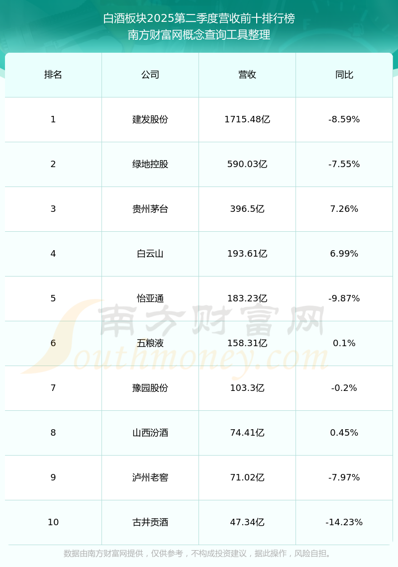 按照南方財富網(wǎng)概念查詢工具統(tǒng)計,該股所屬板塊為白酒板塊,該板塊共有59只股票,水井坊2025第二季度營收在該板塊中排名為第33名,該板塊2025第二季度營收排名前十的股票如下表: