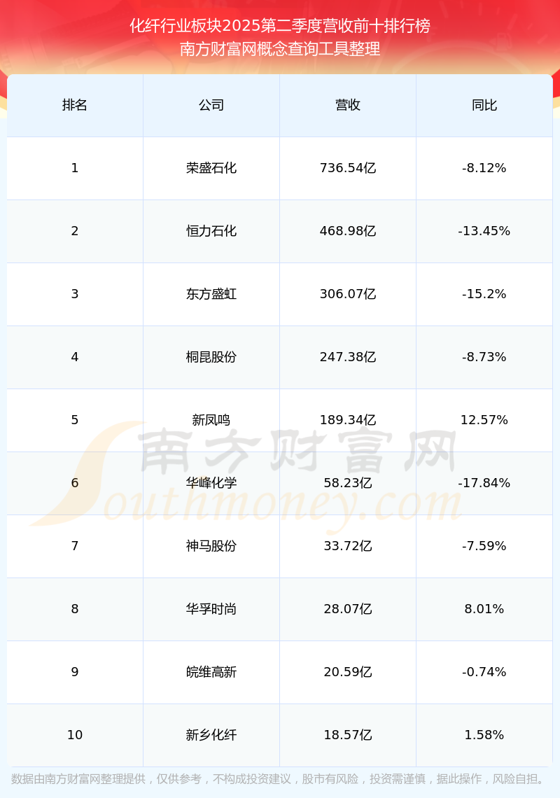 按照南方財(cái)富網(wǎng)概念查詢工具統(tǒng)計(jì),該股所屬板塊為化纖行業(yè)板塊,該板塊共有30只股票,華鼎股份2025第二季度營收在該板塊中排名為第13名,該板塊2025第二季度營收排名前十的股票如下表: