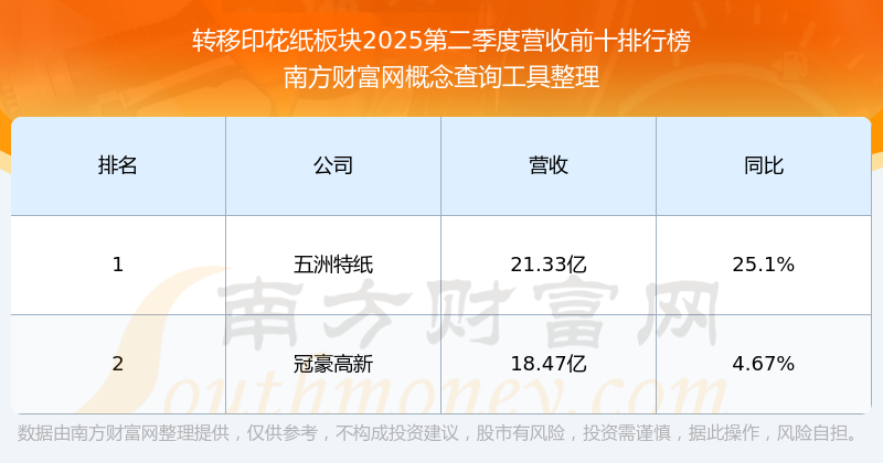 按照南方財富網(wǎng)概念查詢工具統(tǒng)計,該股所屬板塊為轉(zhuǎn)移印花紙板塊,該板塊共有2只股票,五洲特紙2025第二季度營收在該板塊中排名為第1名,該板塊2025第二季度營收排名前十的股票如下表: