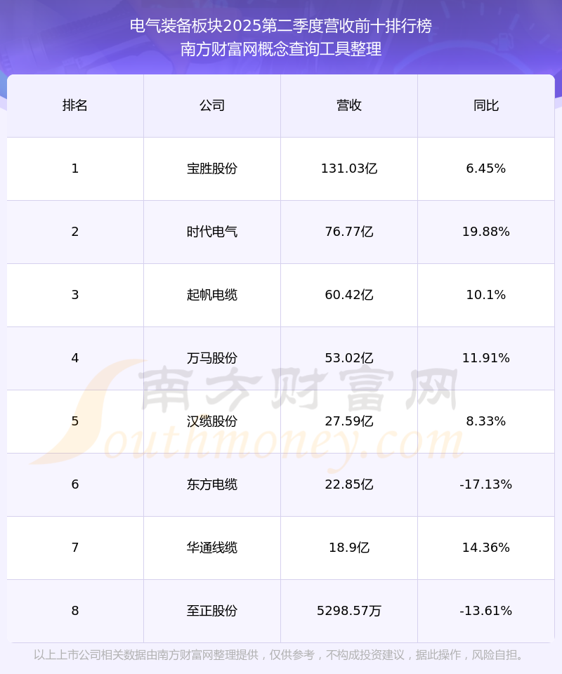 按照南方財(cái)富網(wǎng)概念查詢工具統(tǒng)計(jì),該股所屬板塊為電氣裝備板塊,該板塊共有8只股票,寶光股份2025第二季度營(yíng)收在該板塊中排名為第8名,該板塊2025第二季度營(yíng)收排名前十的股票如下表: