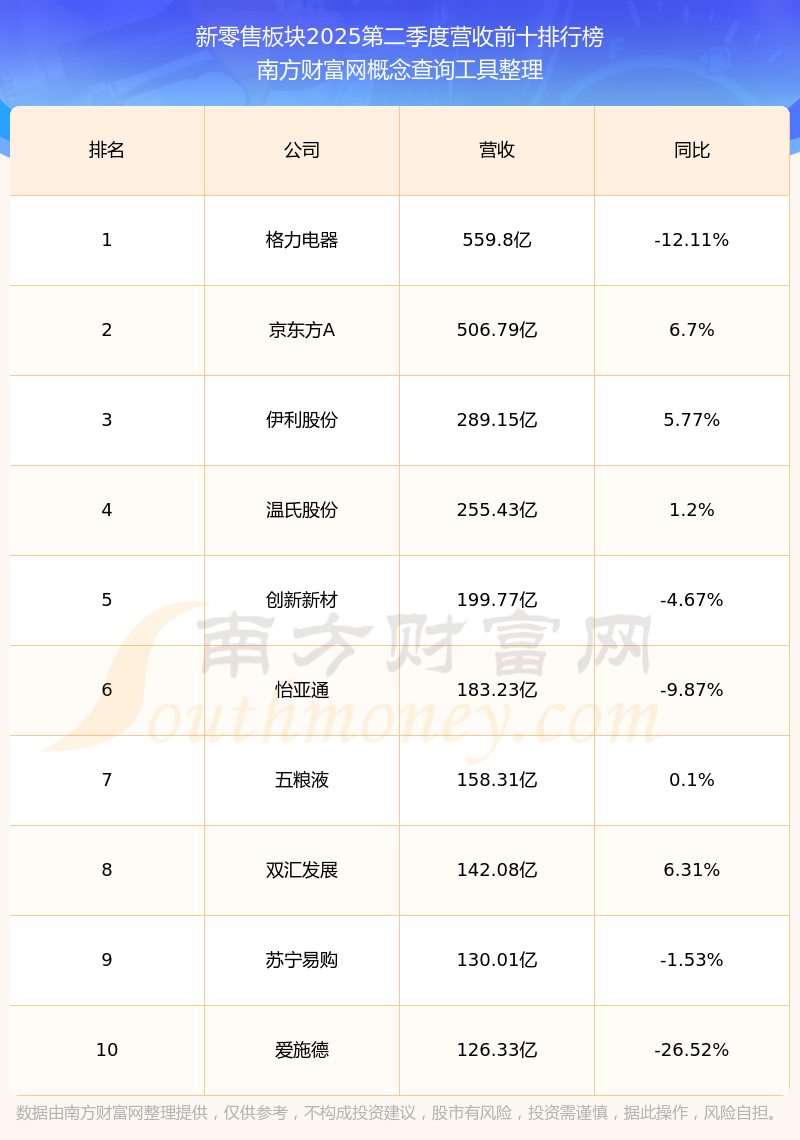 按照南方財(cái)富網(wǎng)概念查詢工具統(tǒng)計(jì),該股所屬板塊為新零售板塊,該板塊共有206只股票,紅豆股份2025第二季度營收在該板塊中排名為第148名,該板塊2025第二季度營收排名前十的股票如下表: