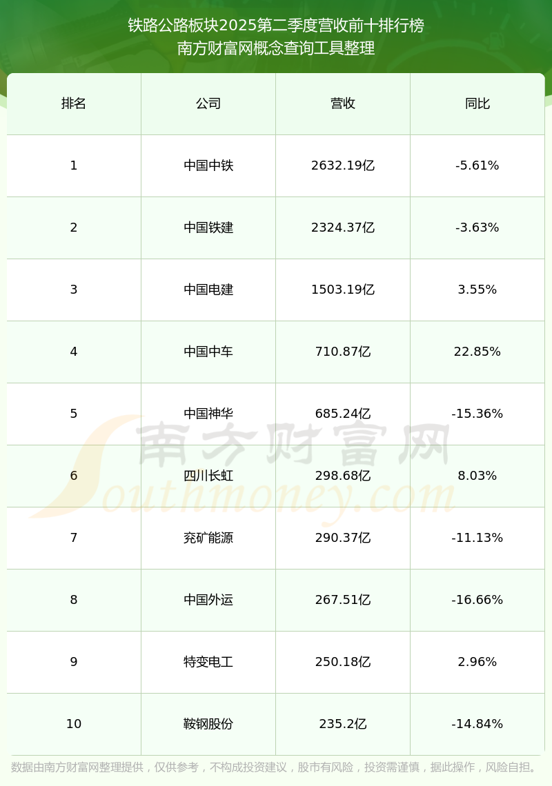 按照南方財(cái)富網(wǎng)概念查詢工具統(tǒng)計(jì),該股所屬板塊為鐵路公路板塊,該板塊共有120只股票,重慶路橋2025第二季度營(yíng)收在該板塊中排名為第120名,該板塊2025第二季度營(yíng)收排名前十的股票如下表: