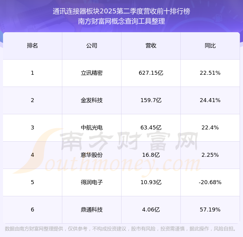 按照南方財富網(wǎng)概念查詢工具統(tǒng)計,該股所屬板塊為通訊連接器板塊,該板塊共有6只股票,鼎通科技2025第二季度營收在該板塊中排名為第6名,該板塊2025第二季度營收排名前十的股票如下表: