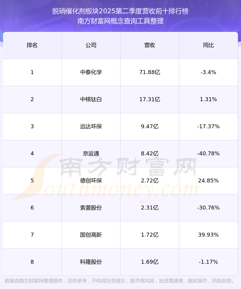 按照南方財(cái)富網(wǎng)概念查詢工具統(tǒng)計(jì),該股所屬板塊為脫硝催化劑板塊,該板塊共有8只股票,元琛科技2025第二季度營(yíng)收在該板塊中排名為第8名,該板塊2025第二季度營(yíng)收排名前十的股票如下表: