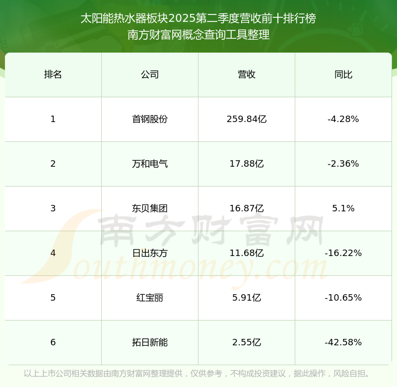 按照南方財(cái)富網(wǎng)概念查詢工具統(tǒng)計(jì),該股所屬板塊為太陽(yáng)能熱水器板塊,該板塊共有6只股票,日出東方2025第二季度營(yíng)收在該板塊中排名為第4名,該板塊2025第二季度營(yíng)收排名前十的股票如下表: