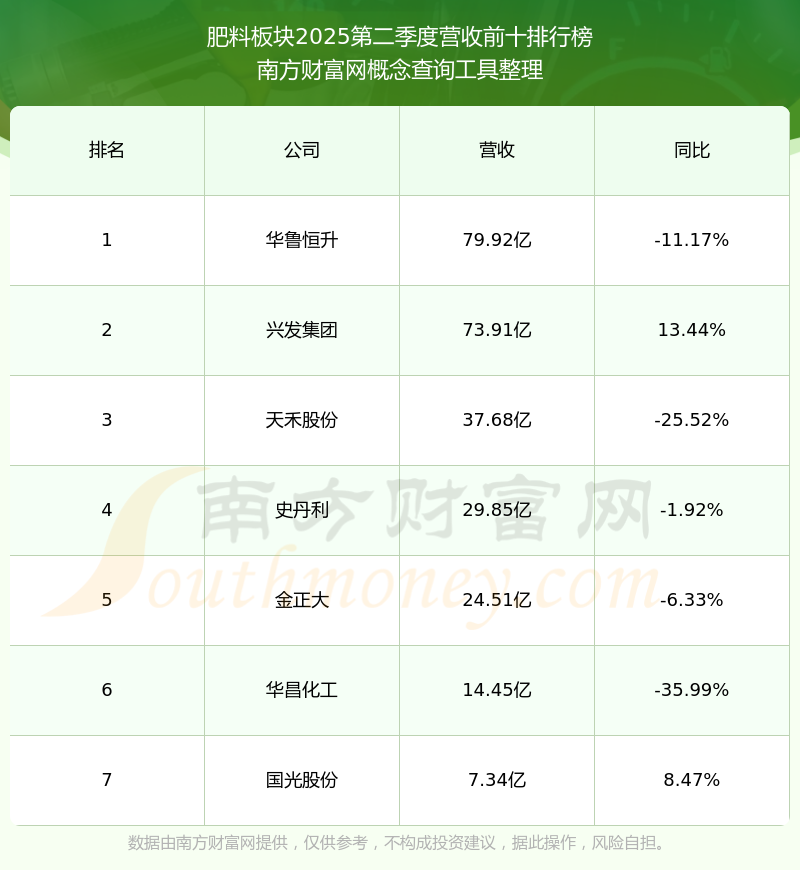 按照南方財(cái)富網(wǎng)概念查詢工具統(tǒng)計(jì),該股所屬板塊為肥料板塊,該板塊共有7只股票,海利爾2025第二季度營(yíng)收在該板塊中排名為第7名,該板塊2025第二季度營(yíng)收排名前十的股票如下表:
