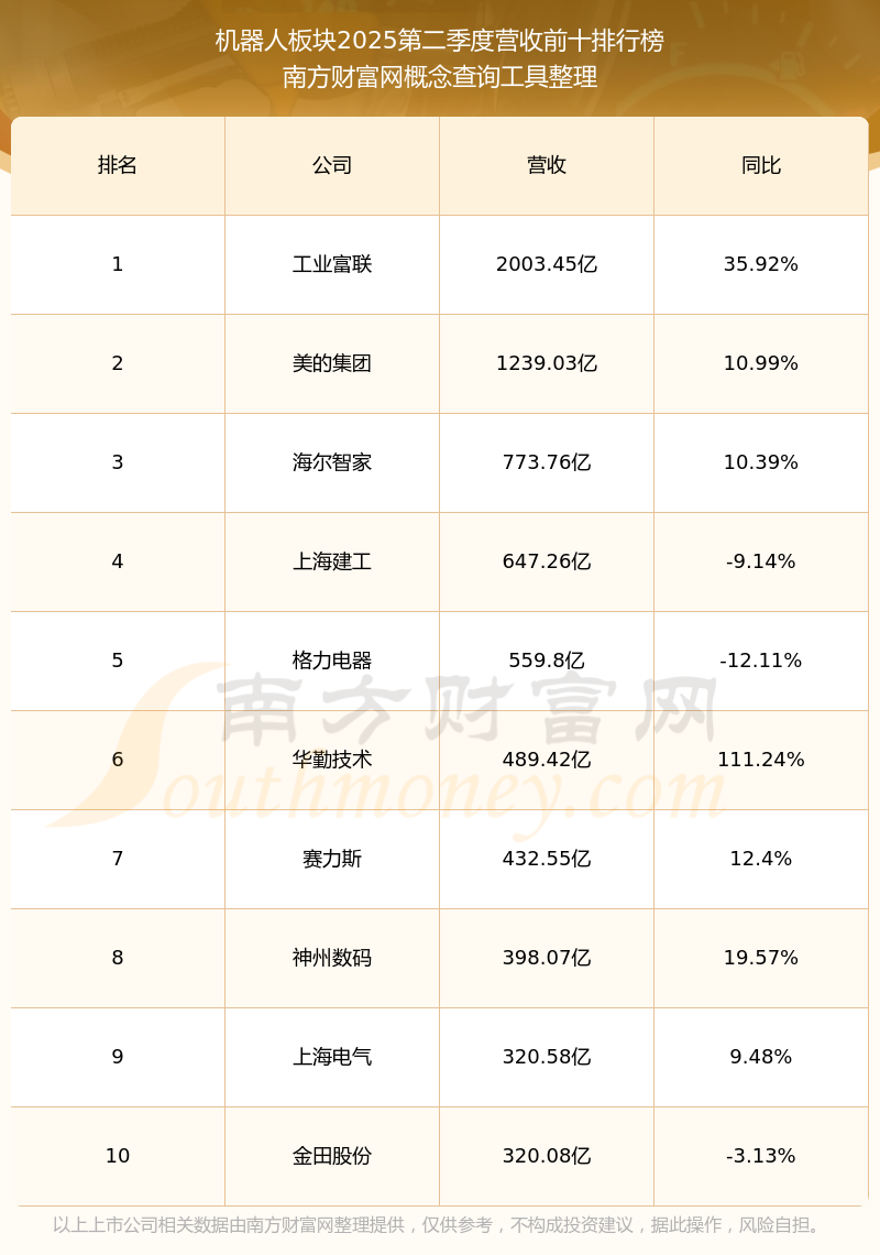按照南方財(cái)富網(wǎng)概念查詢工具統(tǒng)計(jì),該股所屬板塊為機(jī)器人板塊,該板塊共有776只股票,景業(yè)智能2025第二季度營(yíng)收在該板塊中排名為第728名,該板塊2025第二季度營(yíng)收排名前十的股票如下表: