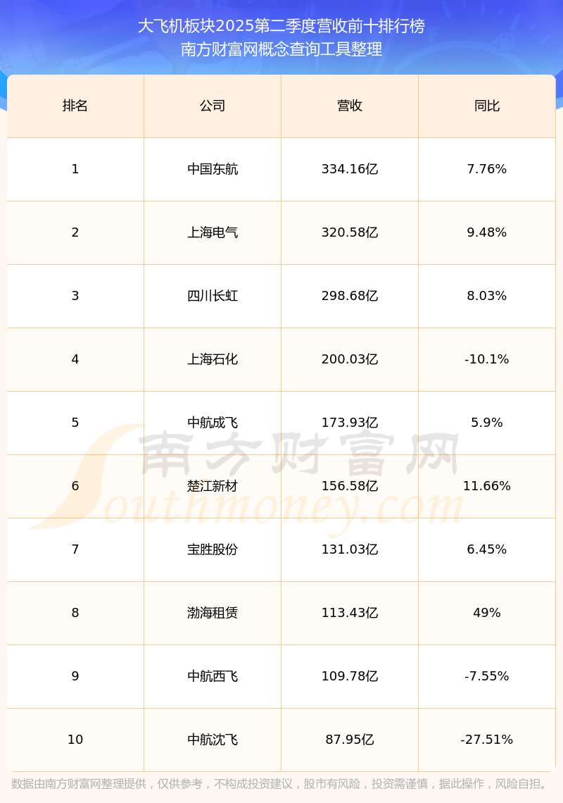 按照南方財(cái)富網(wǎng)概念查詢(xún)工具統(tǒng)計(jì),該股所屬板塊為大飛機(jī)板塊,該板塊共有162只股票,中國(guó)東航2025第二季度營(yíng)收在該板塊中排名為第1名,該板塊2025第二季度營(yíng)收排名前十的股票如下表: